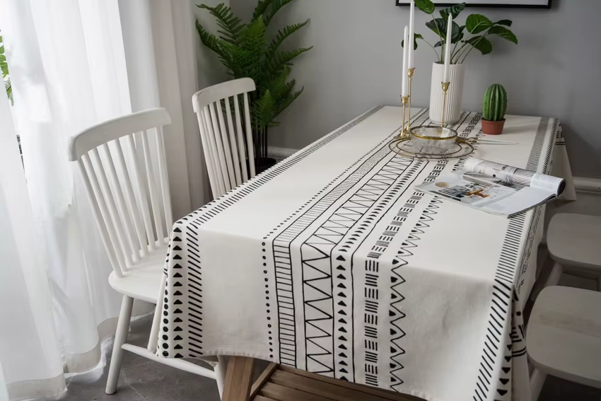 10. Czarno-biały geometryczny obrus – nowoczesny akcent do jadalni